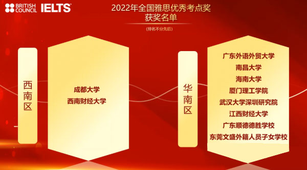 会议上教育考试院对全国各开考考点在2022年疫情防控期间坚持复考、认真组考、严控疫情和服务考生等方面做了肯定,英国文化教育协会也对相关考点在疫情期间的优异表现进行了表彰,全国共26个考点荣获“2022年全国雅思优秀考点”称号,西南财经大学光华校区雅思机考考点作为西南地区考点之一,获得该项荣誉。