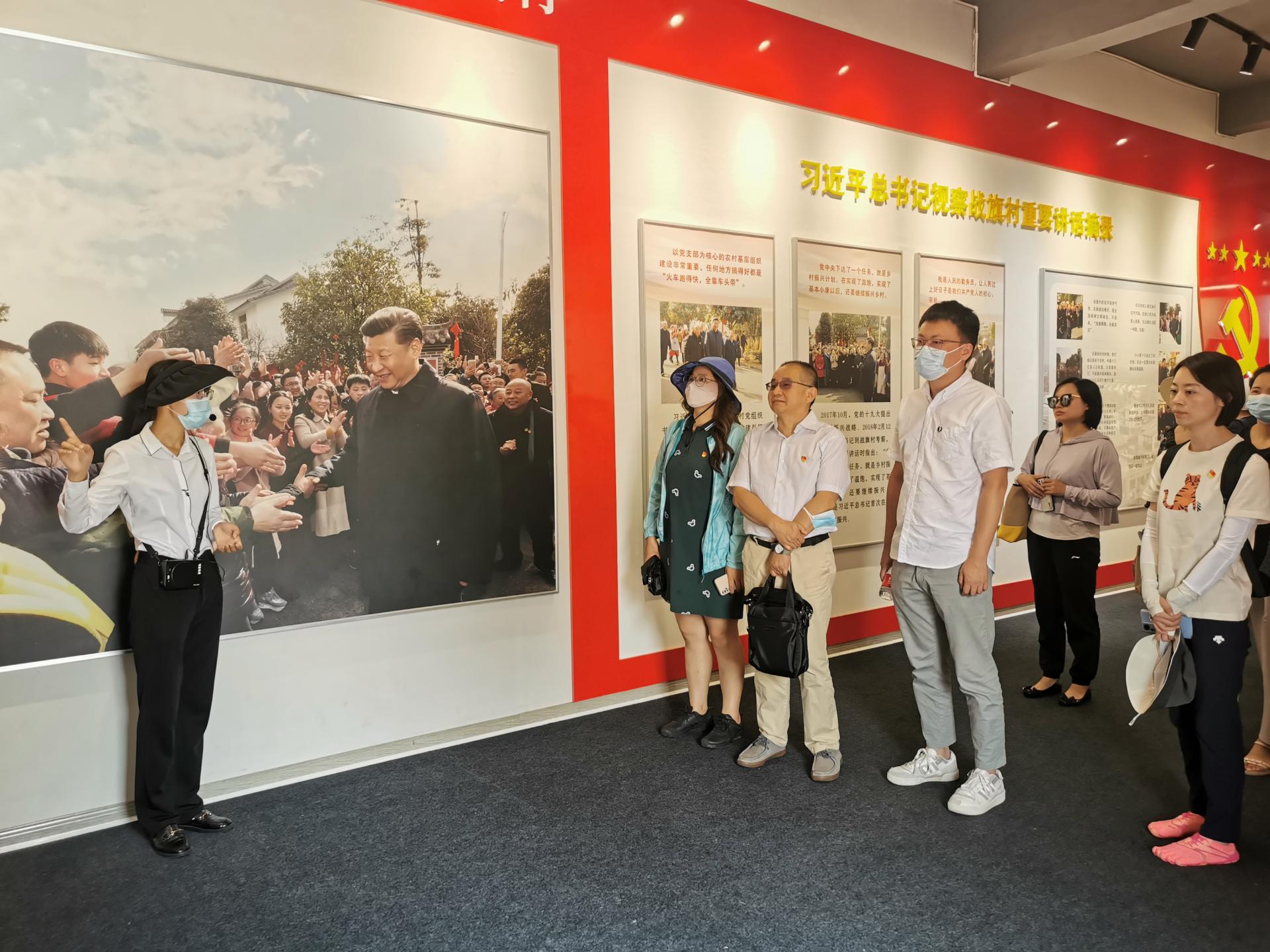 沿着习近平总书记考察战旗村时的路线,活动团队依次参观了战旗村党建馆、村民居住房、战旗产业展示厅、郫县豆瓣博物馆、蜀绣坊、酱油坊、唐昌布鞋展示厅,了解了战旗村的发展历史,实地感受战旗村的巨变。通过参观学习,大家对战旗村‘党建领航、改革兴村、产业富民、乡村文明’的发展模式有了更深刻的理解和认识。在交流座谈环节,大家各抒胸臆,有党员同志分享道:“战旗村的巨变离不开党建领航,战旗村党委创新推行的‘三问三亮’党建工作制,是充分发挥基层党组织战斗堡垒作用和党员先锋模范作用的制度保障,值得我们支部学习和借鉴。”国有资产经营有限公司的员工分享道:“战旗村以党建为引领,因地制宜,发挥当地特色优势,为我们开展对口帮扶、管理干部培训、搭建红色教育培训基地等社会服务工作带来很大启发。”