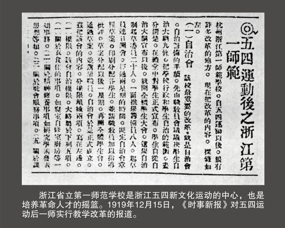校长经亨颐邀请,来到一师担任国文教员。一上任,陈望道为学生上的第一课就是鲁迅的白话文《狂人日记》。他和夏丏尊、刘大白、李次九等老师积极开展反帝反封建的新文化运动,在教学改革中提倡白话文,使一师师生的思想得到了大解放,被称为一师“四大金刚”。但这样的进步努力却触怒了当时的浙江军政当局乃至远在北京的北洋政府,最终引发轰轰烈烈的“一师风潮”。