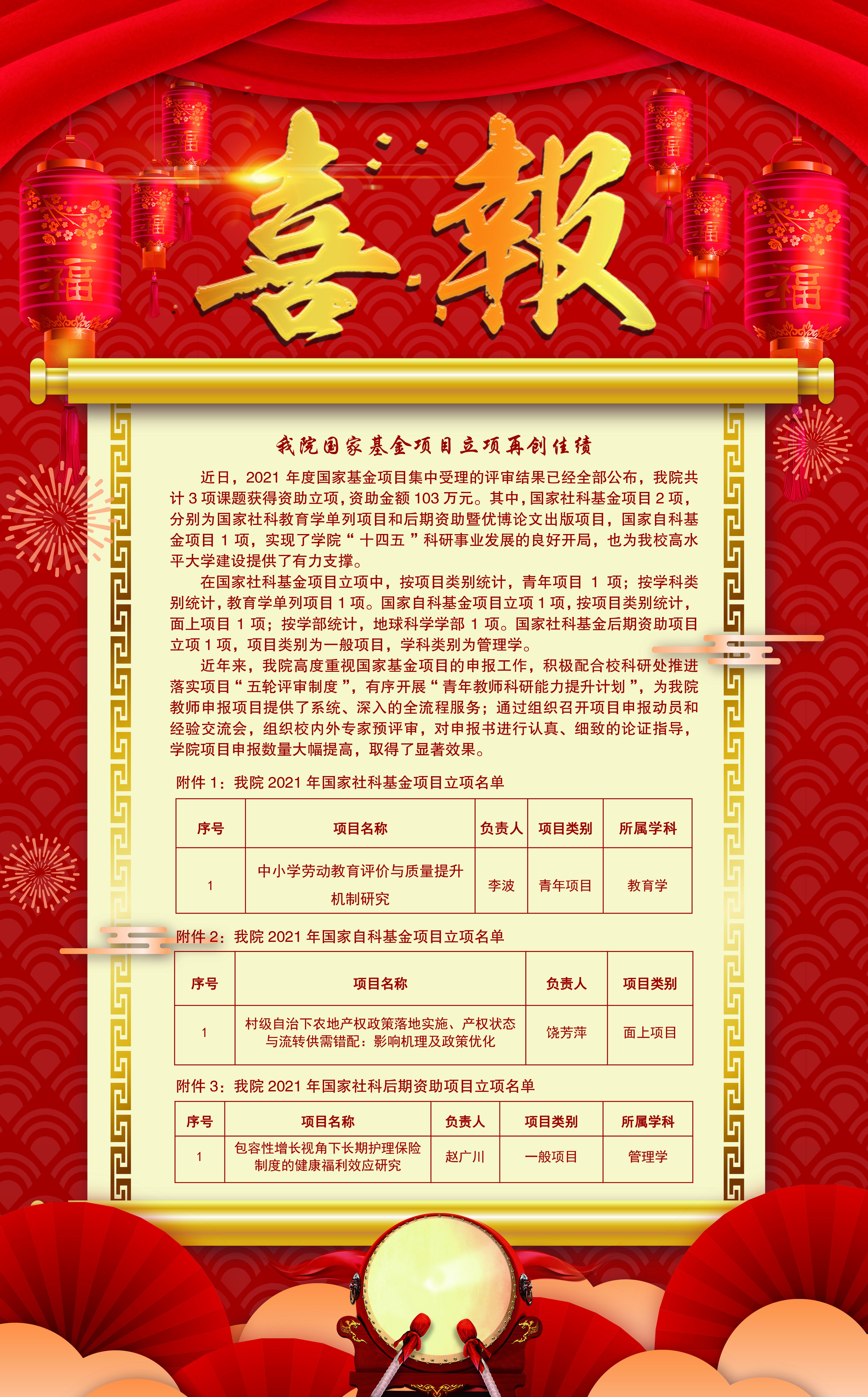1. 李波博士申请的《中小学劳动教育评价与质量提升机制研究》获得2021年度国家社科基金教育单列青年项目立项资助。