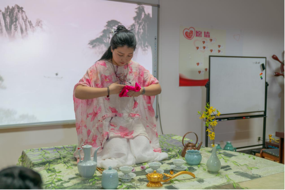 然后,由国家高级礼仪培训师、评茶师赵靖老师,通过对茶文化的介绍、茶叶茶种、名茶品鉴、茶礼以及冲泡等,给大家进行全方位的讲解和演示。