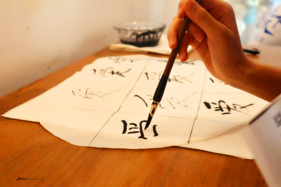 将明信片投入信箱,往下便是毛笔抒爱。新生用毛笔在一张带有网格的心形宣纸上写下“大爱”二字,与澳门银河娱乐场