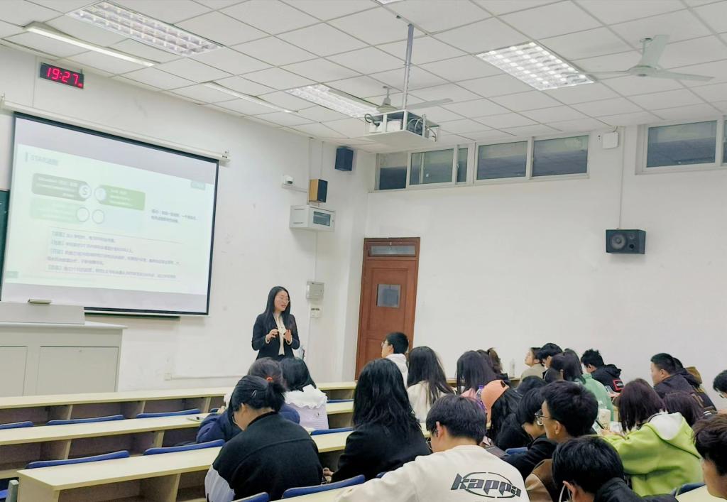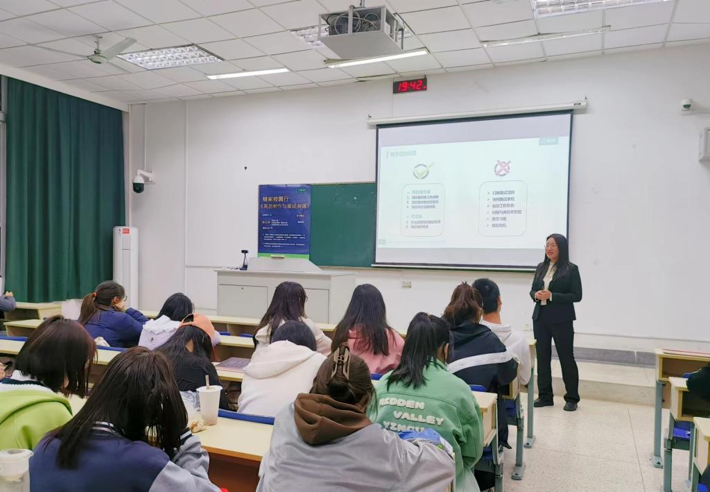 杨云萍以一段"令人心动的offer "视频片段开头,将本次讲座引入了主题。随之她从“我是谁?我有怎样的经验?如何展示自我?”以及“如何顺畅的面对自己今后的身份变化”两个方面分别向同学们传授求职经验与面试技巧。在简历制作方面,她强调简历的内容与版式十分重要,并细致讲述了个人基本信息、教育经历、个人经历如何写?怎样写出亮点?在面试过程方面,她从着装打扮、面试礼仪以及临场应对等方面切入,对大学生面试过程中出现的难点、痛点进行了一一解析。最后,杨云萍女士对本次讲座的主要内容进行总结,期望学生能够在自己的职场蓝海中熠熠生辉,明确人生目标,掌控人生之舵,奋进时代征程。