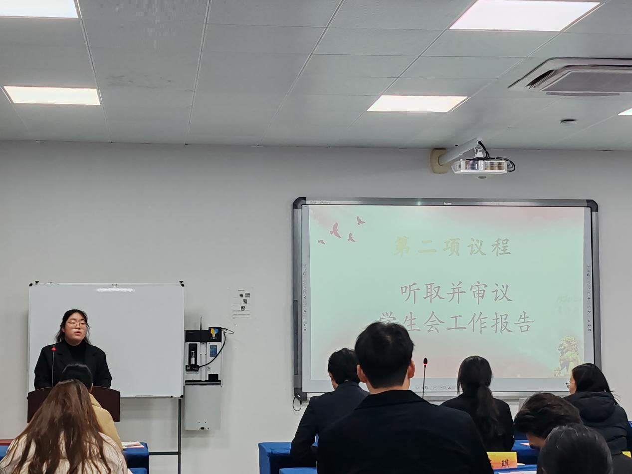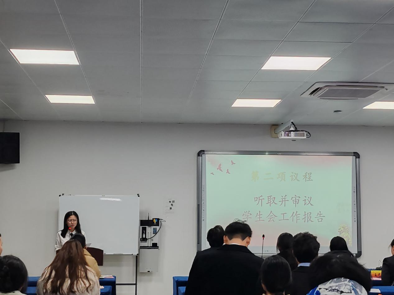 第二项议程——听取并审议学生会工作报告。会议上,姚瑶同学作为代表向参会人员作关于学生会工作的报告,学生委员会对报告内容进行全面审议,包括工作总结、成果展示、问题分析等方面,并提出审议意见和建议。