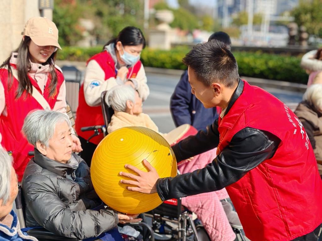 学生志愿者在社区工作人员的带领下积极准备一系列活动,陪老人聊天晒太阳,开展传球游戏,赠送康乃馨并合影留念,陪伴老人上楼休息并参观打扫其居住环境,为老人们送去了关爱与祝福。
