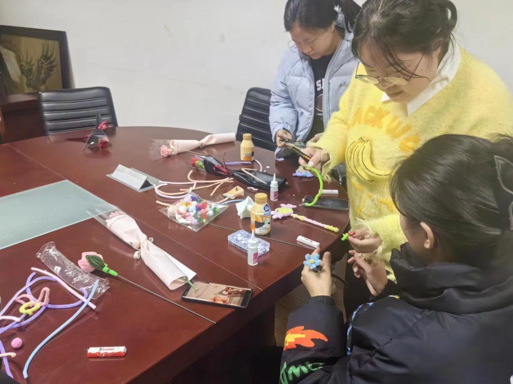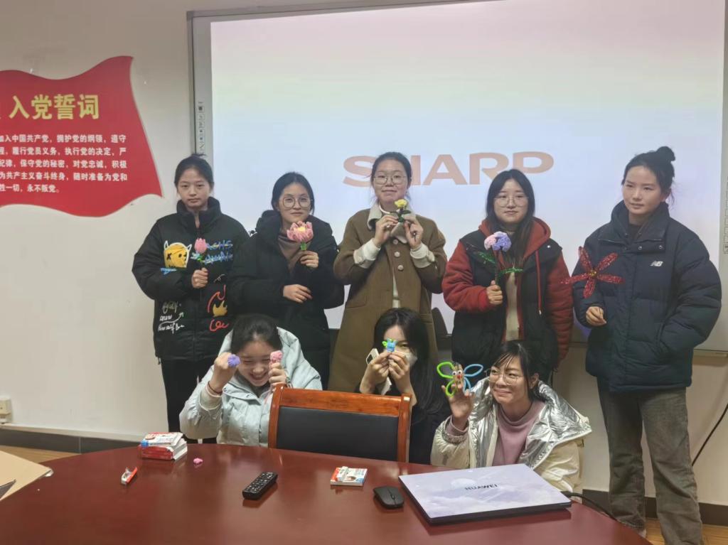 在德济楼508举办以“致敬‘她力量’”为主题的三八妇女节活动。活动一、大家一起观看关于“三八妇女节”的视频;活动二、大家互相交流感想;活动三、大家围坐在一起用扭扭棒编花;活动四、为大家分发鲜花和巧克力;活动五、所有人一起合影留念。