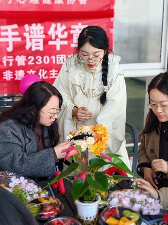 活动伊始,同学们用生动的语言讲述了簪花的历史由来,并点明了本次活动的目的。一朵朵鲜花在手中绽放,仿佛诉说着每个人心中独一无二的故事。随后,同学向老师们详细介绍了簪花的制作手法。老师们认真聆听,并在同学们的引导下,开始挑选心仪的鲜花,为后面的手工制作做准备。