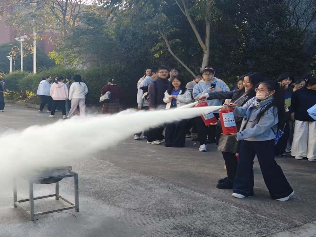 随后,活动进入了实操环节。在专业人员的指导和保护下,新生们分批进行了灭火器的实际操作。面对模拟的初期火源,同学们按照“提、拔、握、压”的四字口诀,沉着冷静地操作干粉灭火器,成功将“火魔”扑灭。