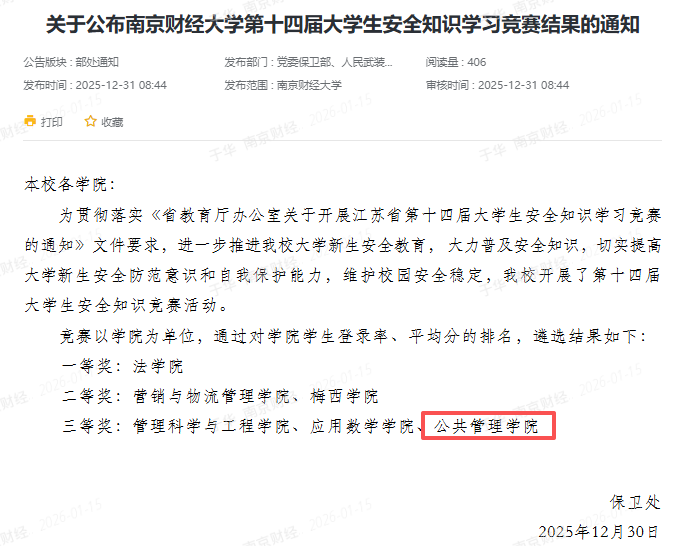 通过参与此次竞赛,不仅提升了同学们的安全防范意识,也为构建平安校园贡献了力量。澳门银河娱乐场 将以此次获奖为契机,继续加强安全教育工作,切实提升学生安全防范意识与自我保护能力,为平安校园建设贡献更多公管力量。