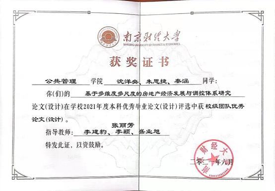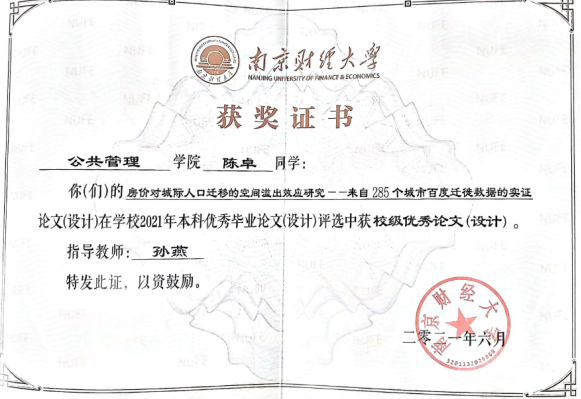 2017级房地产开发与管理专业学生陈卓的毕业论文“房价对城际人口迁移的空间溢出效应研究——来自285个城市百度迁徙数据的实证”(指导老师:孙燕)在澳门银河娱乐场 2021年度本科优秀毕业论文评选中获得校级优秀论文;沈洋央、朱思捷、秦涵等同学的论文“基于多维度多尺度的房地产经济发展与调控体系研究”(指导老师:张丽芳、李建豹、李颖、盛业旭)获校级团队优秀论文。