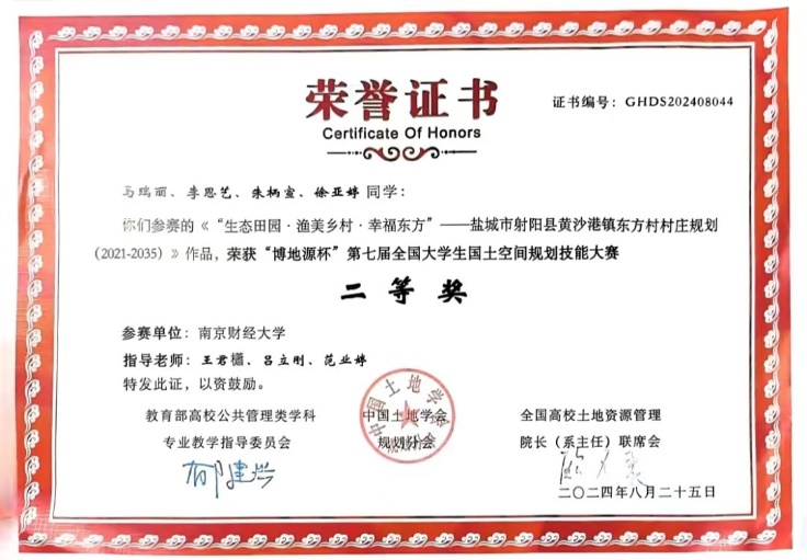 8月25日,“博地源杯”第七届全国大学生国土空间规划技能大赛决赛在河海大学江宁校区举行,初赛共有95所高校167支队伍,经过专家匿名评选,63支队伍进入决赛。经过两轮角逐,我中心选送的参赛作品《“生态田园•渔美乡村•幸福东方”盐城市射阳县东方村村庄规划(2021-2035)》(成员:马瑞丽、李思艺、朱柄宣、徐亚婷;指导教师:王君櫹、吕立刚、范业婷),荣获全国二等奖。