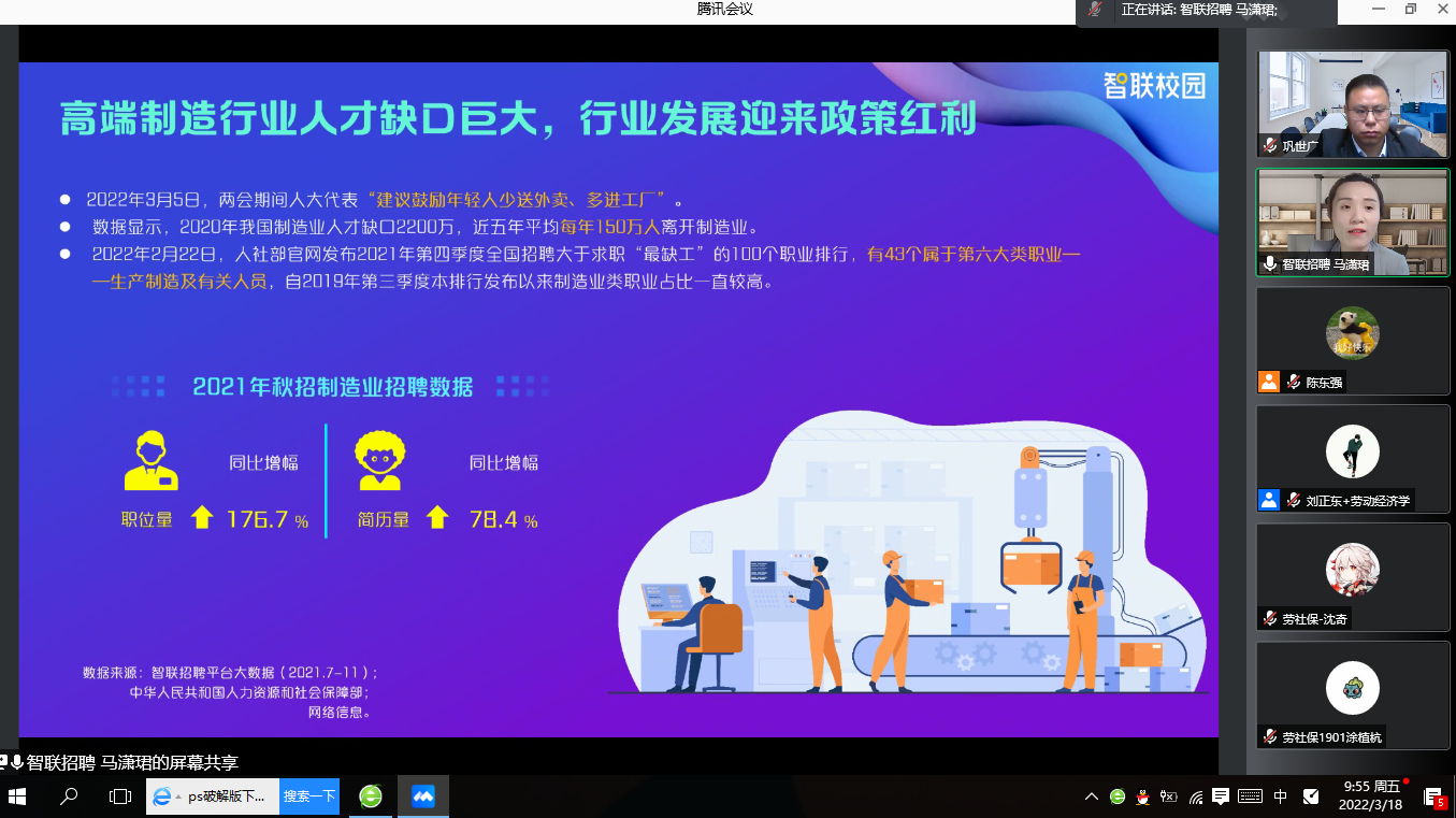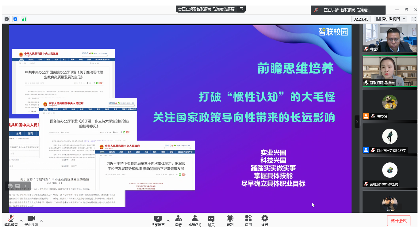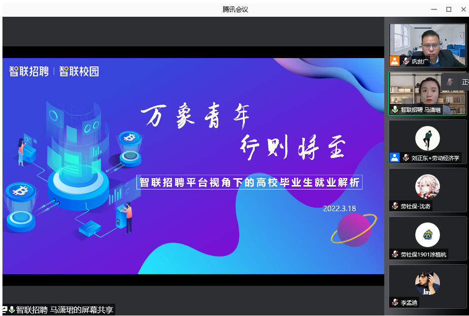 于3月18日上午通过腾讯会议线上举办了主题为“行则将至——智联招聘平台视角下的高校毕业生就业解析”的就业培训专题讲座,本次讲座由智联招聘校园及国际业务事业部执行总监马潇珺主讲,澳门银河娱乐场