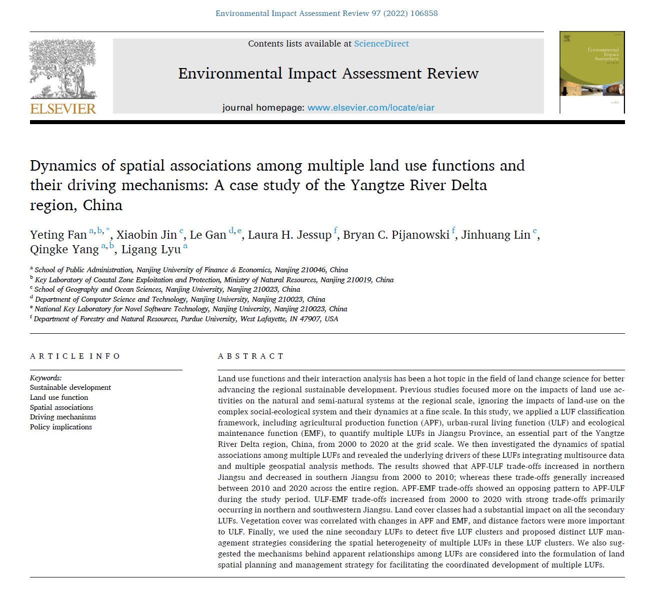 论文标题:多种土地利用功能空间关联动态及其驱动机制——以长三角地区为例(Dynamicsof spatial associations among multiple land use functions and theirdriving mechanisms: A case study of the Yangtze River Delta region,China)