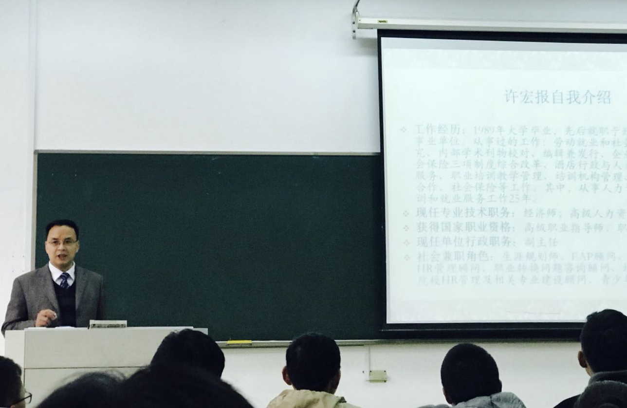11月22日下午,南京市职业技术培训指导中心副主任许宏报在澳门银河娱乐场 仙林校区德正楼作主题为“大学、专业、未来”的学术讲座,澳门银河娱乐场 劳动与社会保障专业任课教师与1701班全体同学聆听了此次讲座。