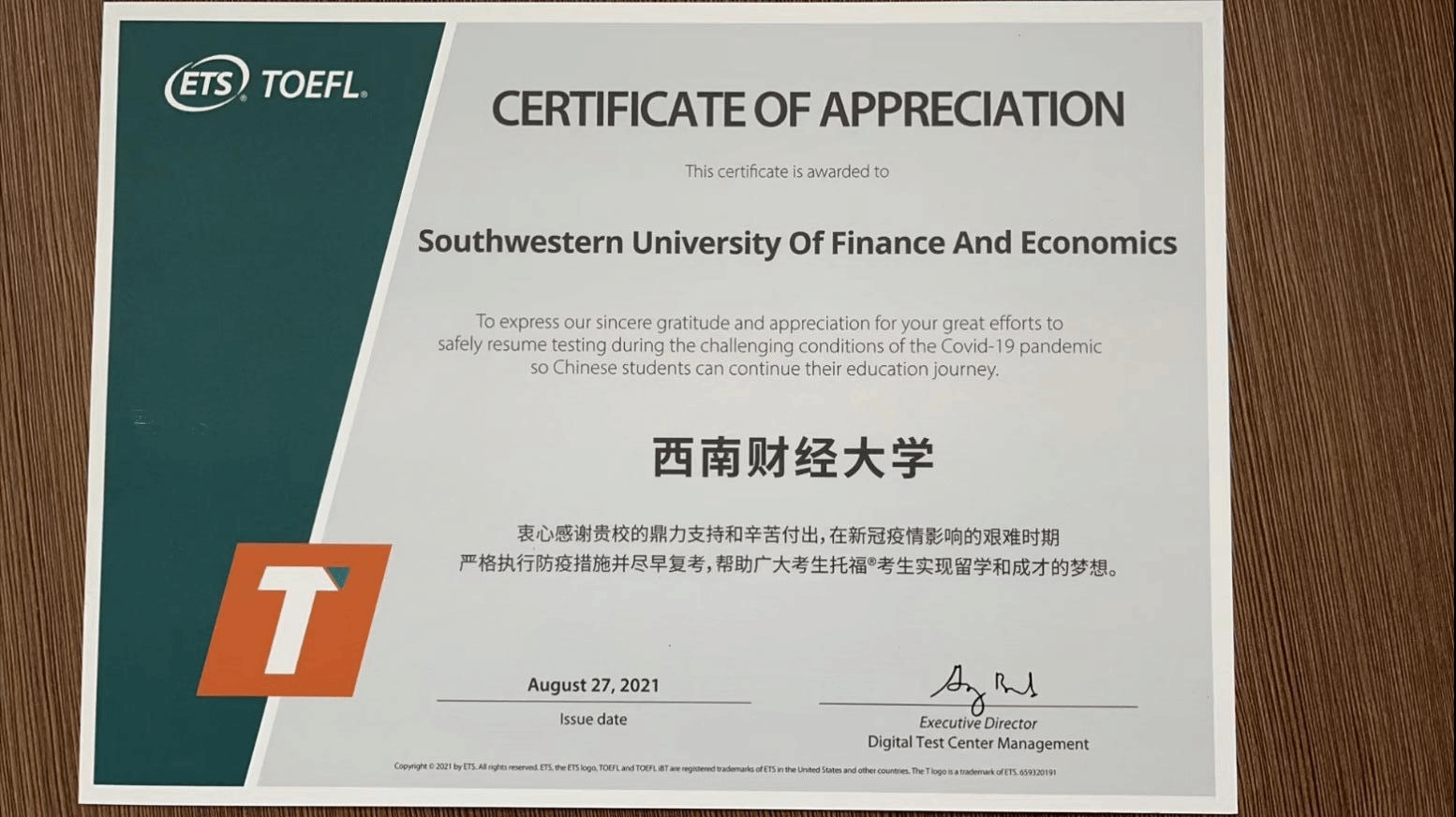 考点也获得了托福、GRE考试主办方美国教育考试服务中心(ETS)所颁发的感谢状。