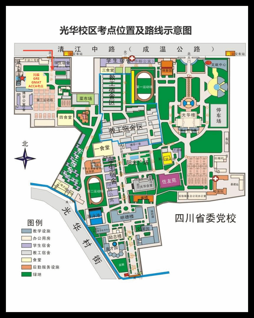 3.路线提示:参加各项海外考试考生须从西南财经大学光华校区北三门进出。北三门位于成都市青羊区清江中路57号,地铁四号线B出口前方约10米,金沙公交枢纽站对面。光华校区其它校门不允许考生进出。