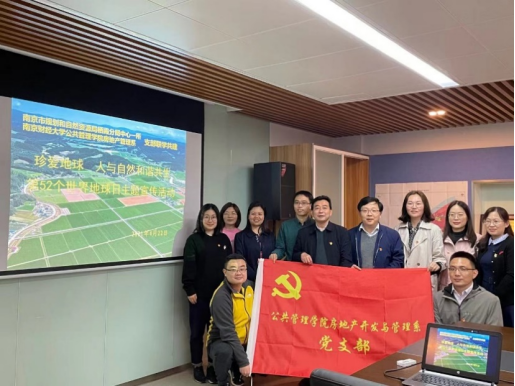 房地产开发与管理教工党支部与栖霞分局中心一所党支部共建活动为载体,开展“世界地球日”主题宣传活动。南京市规划和自然资源局栖霞分局副局长周根宝同志、中心一所党支部书记杨炬烽同志以及澳门银河娱乐场
