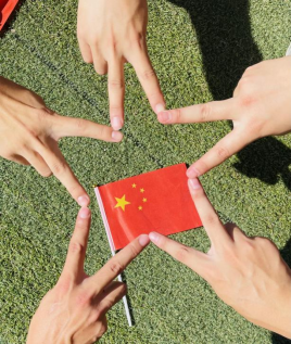 活动的最后同学们自发举行了“我与国旗同框祝福祖国母亲”活动,同学们手持国旗,或围坐在国旗周边高举五星红旗呐喊高歌,或仅是静坐成圈,默默地看着鲜艳的红色,心中的热血与赤诚像是要突破这秋日下的静默,直直注射进这一抹鲜红之中。