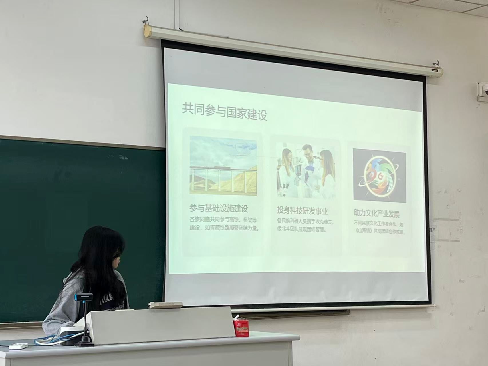 活动伊始,班长娜迪热·阿迪力结合PPT展示了青藏铁路、新疆棉田现代化建设等祖国重大工程中的民族团结故事,讲述各民族建设者携手扎根一线、共筑发展的历程,让同学们直观看到民族同心在国家建设中的重要作用。随后的分组讨论环节,同学们围绕“新时代大学生如何在专业学习中融入民族情与爱国心”展开交流,劳动与社会保障专业的同学结合专业特点,提出要关注民族地区社保体系建设、助力边疆民生发展的想法;部分同学分享了暑期参与民族地区支教、基层调研的经历,讲述自己在实践中感受到的各民族互帮互助的温暖。